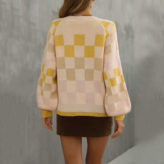 Fashion Casual Loose Checkered Contrast Color Knitted Cardigan