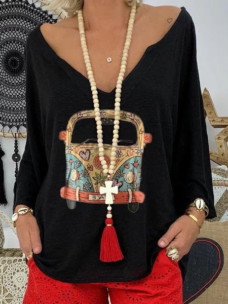 Fashion V-Neck Cartoon Car Print T-Shirt